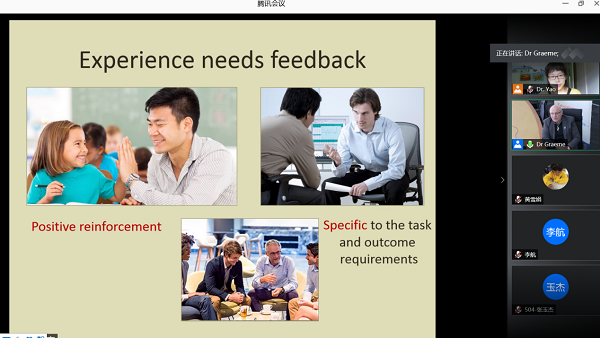 7月30日,新西兰UUNZ 商学院首席运行官Dr. Graeme Sterne 通过腾讯会议平台为我校107名英语教师开展主题为“Creating Student-Centered Learning”专题讲座,围绕“以学生为中心”的英语教学改革,从教育理念、教学原则、课堂教学模式、学生自主学习、自主发展等多个方面进行了全面、系统的讲解。讲座由新西兰UUNZ 商学院学术带头人Dr.Jenny Yao 主持。